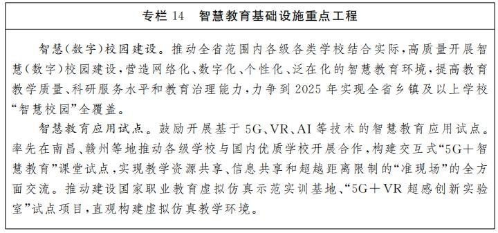 智慧教育基础设施建设。优化升级学校网络接入和带宽条件,推动5G网络校园覆盖。推进各级各类学校智慧校园建设,充分利用“5G+VR”等技术建设智慧教室、智慧实验室、全息课堂等具有实践性和互动性的学科教室,加快建设在线智能教室、虚拟工厂、数字图书馆等智能学习空间,形成泛在化、智能化学习体系。加强职业院校、高校虚拟仿真实训教学环境建设,打造一批融合仿真技术、体感技术等新技术的职业教育信息化实训基地,提升职业学校教学水平。推动各类学校接入江西省教育资源公共服务平台“赣教云”,推进“互联网+教育”大平台建设,建设江西省“名师课堂”“名校网络课堂”,普及“智慧作业”在高年级应用,扩大优质教育资源覆盖范围,实现“优质资源班班通”。探索发展数字化、在线化老年大学、学历教育、社会培训等特色教育,推动其他数字校园资源向特色教育机构开放。