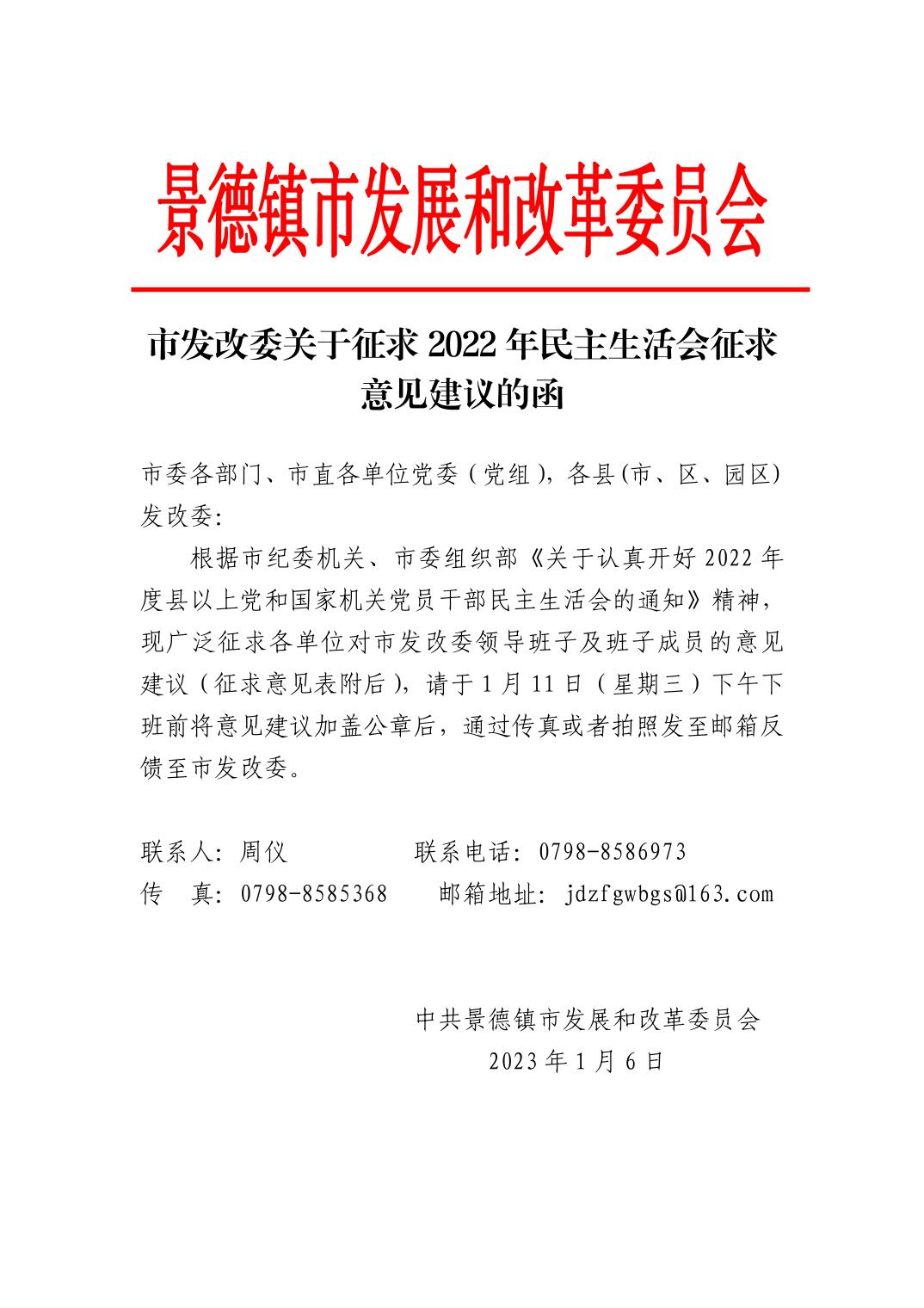 市发改委关于征求2022年民主生活会征求意见建议的函