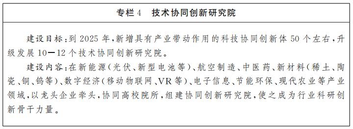 2.组建技术协同创新研究院。聚焦新兴产业和跨界融合发展产业领域,开展科技协同创新体顶层设计,整合创新资源,组建一批“创新目标明确、创新机制灵活、创新平台高端、要素高效集聚、创新成果丰硕、产业支撑有力”的技术协同创新研究院,依托南昌、赣江新区、赣州、上饶、吉安等地的技术创新优势,打造若干区域技术协同创新集聚区,引导省内外高水平研发机构落户。