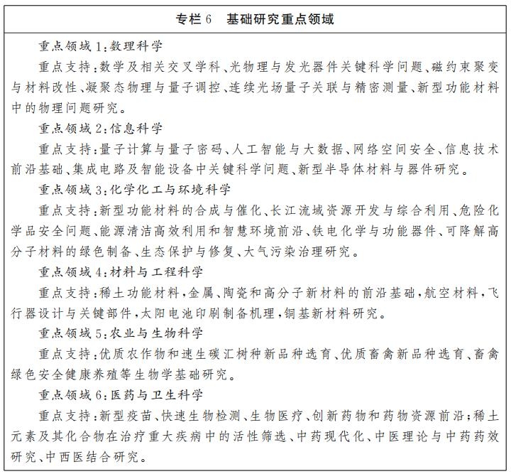 支持具有颠覆性的前沿基础和制约我省经济、社会、科技发展的关键科学问题研究。积极争取国家自然科学基金项目资助,瞄准我省优势学科和交叉学科的重要前沿方向,重点支持航空、电子信息、装备制造、新材料、新能源、中医药和种质资源等领域关键基础问题和相关交叉学科的基础研究,加强对数学、物理等重点基础学科支持力度。打造1-2个省基础学科研究中心,ESI(基本科学指标数据库)前1%学科保持稳步增长。