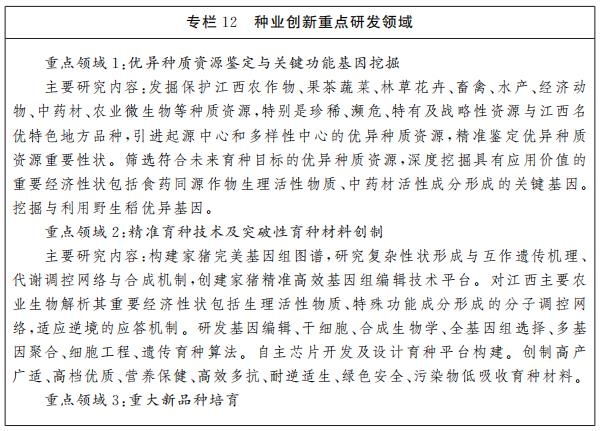 加快推进现代种业创新发展,重点部署优异种质资源鉴定与关键功能基因挖掘、精准育种技术及突破性育种材料创制、重大新品种培育、良种高效繁育等领域的前沿科技和关键核心技术攻关,为实现重要农产品的种源自主可控提供科技支撑。
