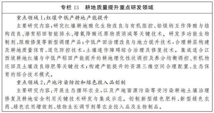 面向藏粮于地、土壤地力培育与健康保育、受污染耕地土壤治理修复的科技需求,重点部署红壤中低产耕地产能提升、产地污染防控和绿色投入品创制等领域的前沿科技和关键技术研究,为提升耕地质量提供科技支撑。