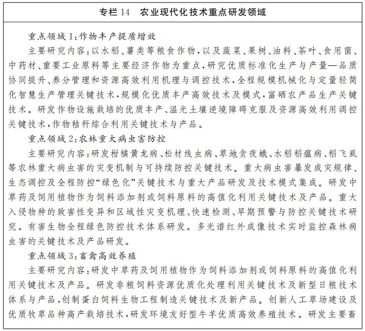 面向全面推进乡村振兴的科技需求,重点部署种业创新、耕地质量提升、农业现代化、食品制造与农产品物流等领域的前沿科技和关键核心技术攻关,为加快推进农业农村现代化提供科技支撑。