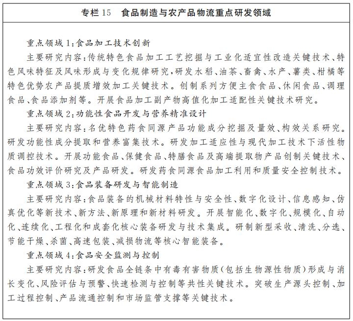 立足食品制造与农产品物流产业链延伸发展的科技需求,重点部署传统特色食品加工技术、名优特色药食同源农副产品功能性食品开发与营养精准设计、装备研发与智能制造、安全监测与控制、生鲜农产品产后供应链绿色保鲜与减损等领域的关键技术研究,为做强我省农产品高值化加工、冷链储运等关键环节提供科技支撑。