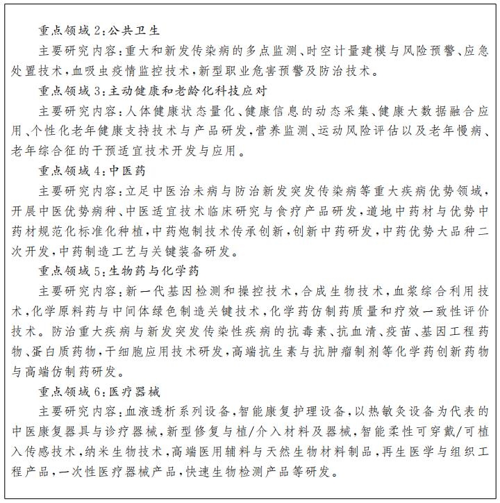 面向人民生命健康需求,大力开展医疗卫生、公共卫生、主动健康和老龄化,以及中医药、生物药、化学药、医疗器械等领域技术攻坚,在医疗卫生领域夯实自主创新基础。