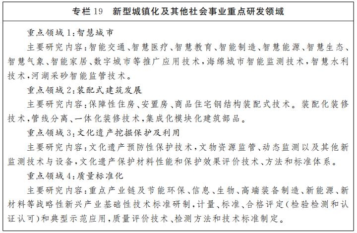 围绕新型城镇化建设,加快智慧城市科技创新步伐,推进装配式建筑发展创新,加强特色文化遗产价值挖掘保护的重大科技创新及应用示范,加强质量标准化科技创新,推动城镇可持续人居环境建设和公共服务功能提升。