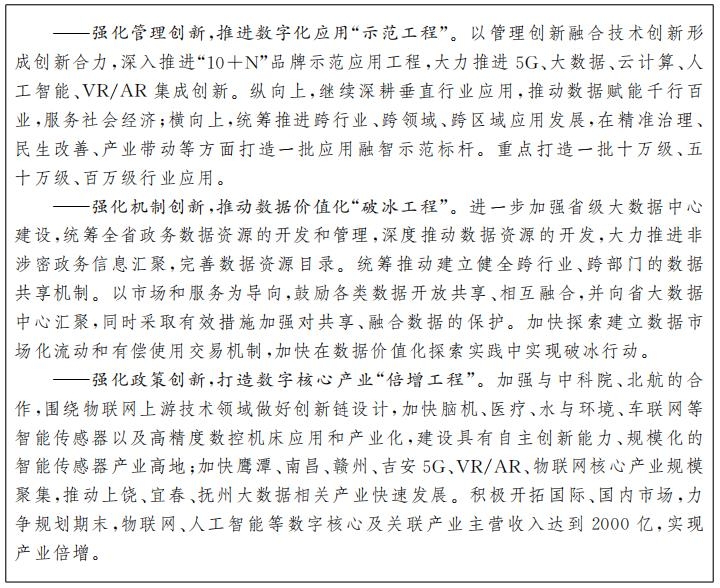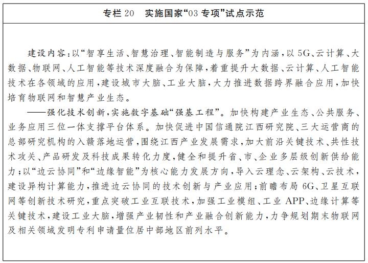 打造“物联江西”升级版,促进“03专项”全面提质增效。以“智联江西”融入“数字江西”,加速推进5G、物联网、大数据、云计算、VR/AR、人工智能等新一代信息技术与江西实体经济深度融合。打造一批百万量级连接规模的全国标杆示范应用,建设一批具有全国知名度的物联网公共服务和行业应用平台,培育一批具有国际市场影响力的龙头企业,加快形成产业链上下游联动、国内国际双循环彼此促进的数字化产业生态,基本建成物联网产业的“江西高地”。积极争取新一轮国家科技中长期战略规划纲要明确的相关科技重大专项成果在江西省落地转化。