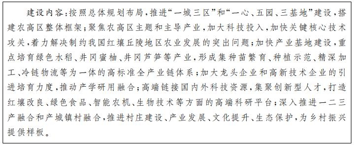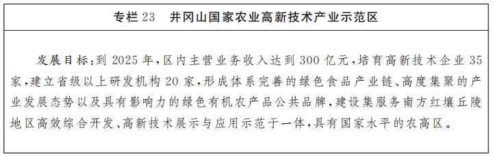 1.加快井冈山国家农高区升建。围绕南方红壤丘陵综合高效开发主题和绿色食品主导产业,按照“一城三区”整体空间布局,加快井冈山农高区“一心、五园、三基地”建设进程,高标准升级建设井冈山国家农业高新技术产业示范区,积极引导高等学校、科研院所、科技型企业等优势创新创业资源和要素向农高区集聚,打造现代农业创新高地、人才高地、产业创新高地。