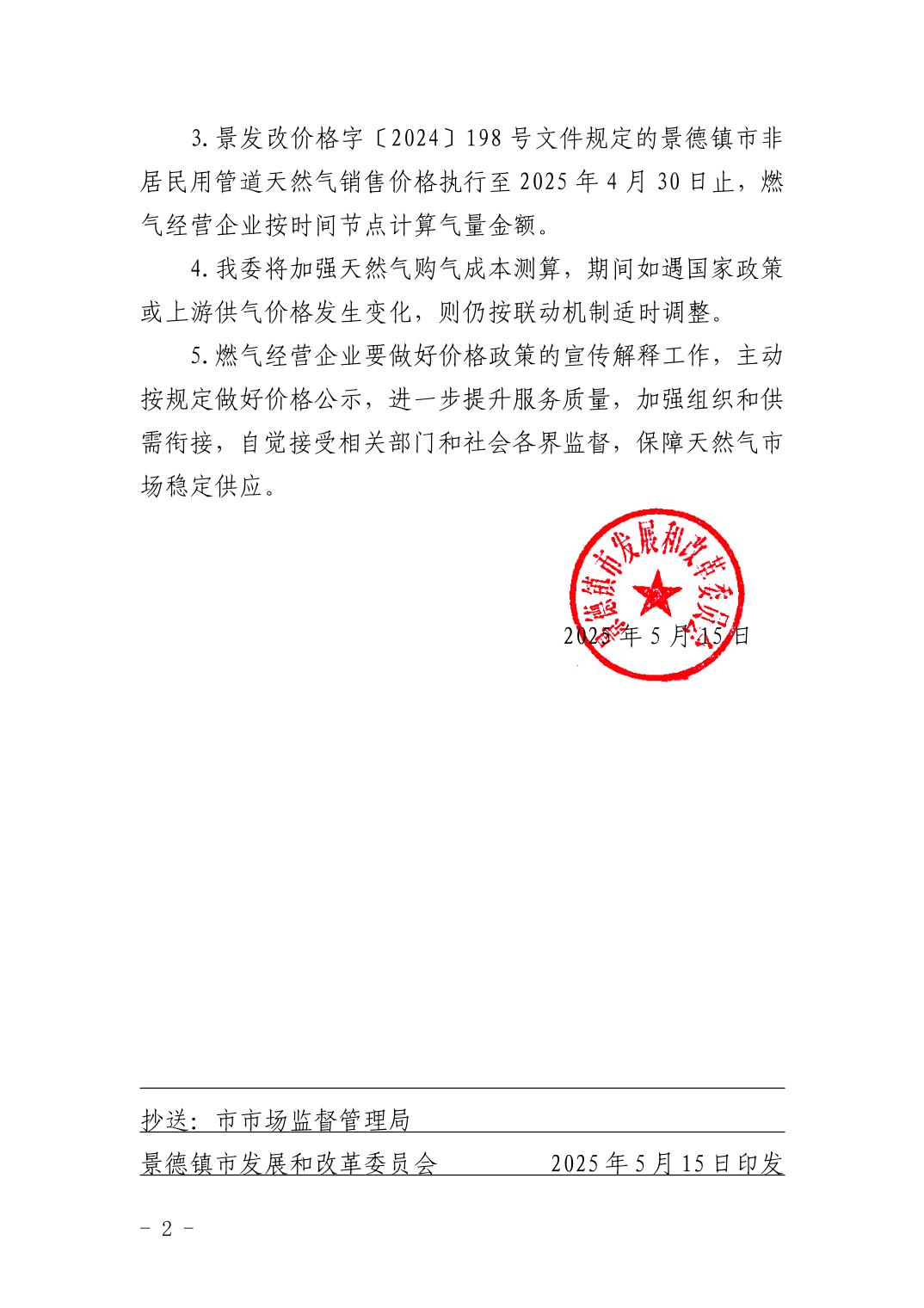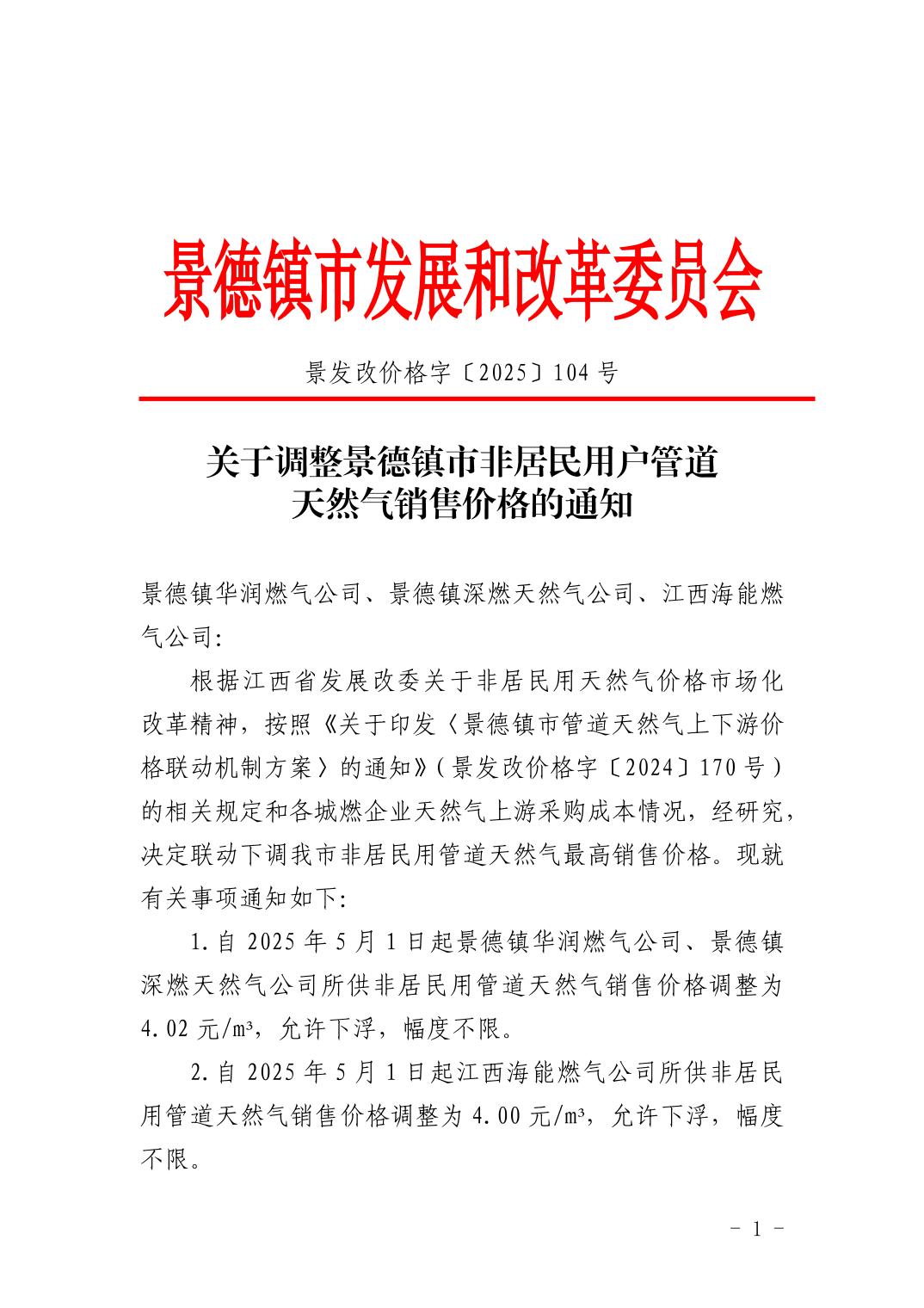 景发改价格字〔2025〕104号关于调整景德镇市非居民用户管道天然气销售价格的通知