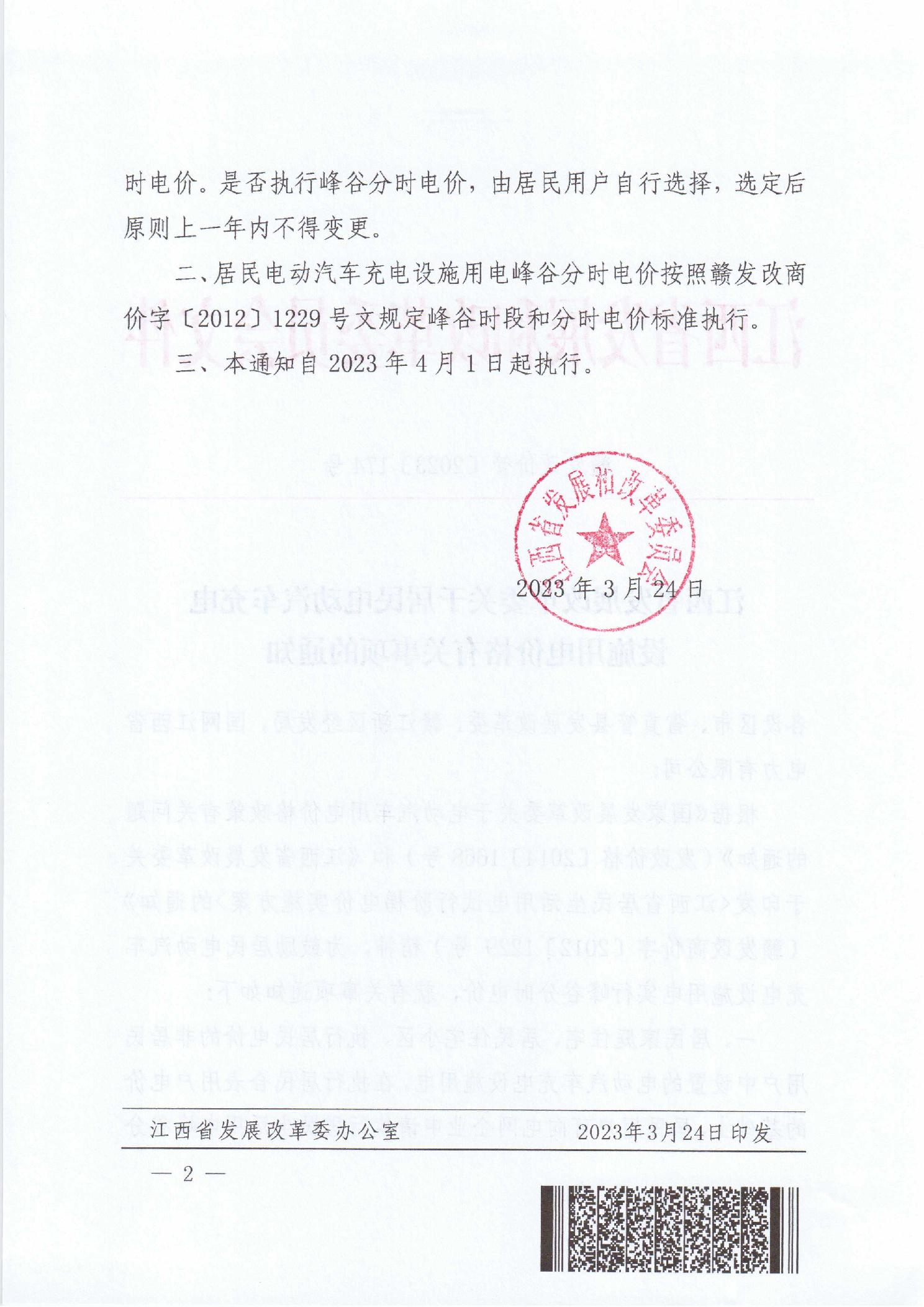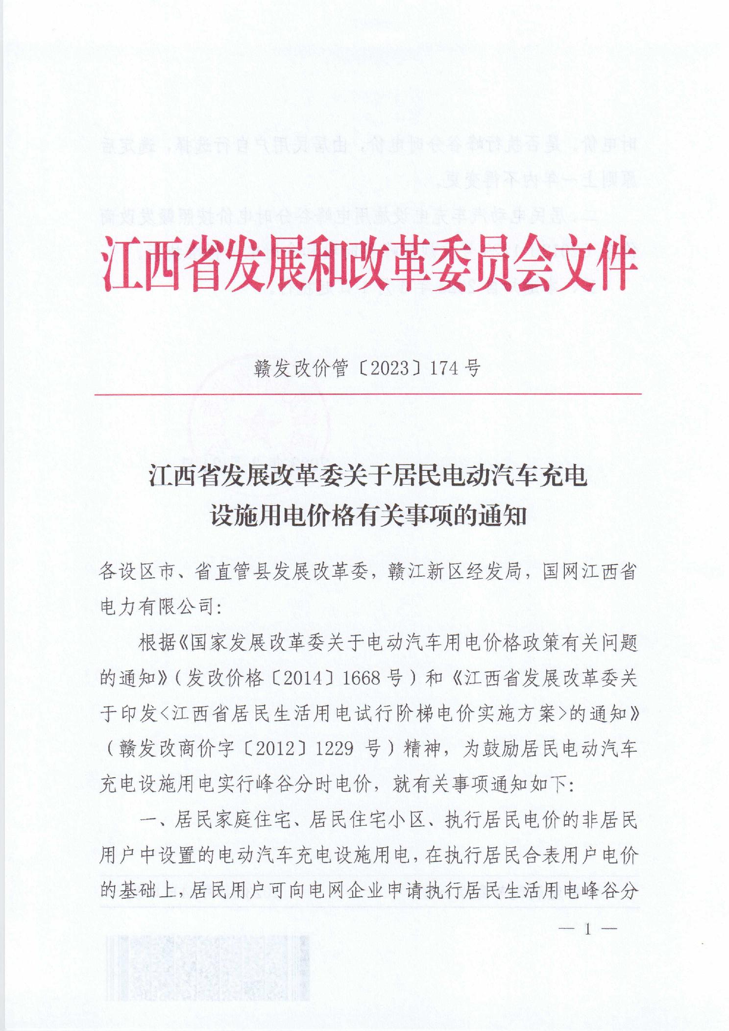 江西省发展改革委关于居民电动汽车充电设施用电价格有关事项的通知(赣发改价管〔2023〕174号)