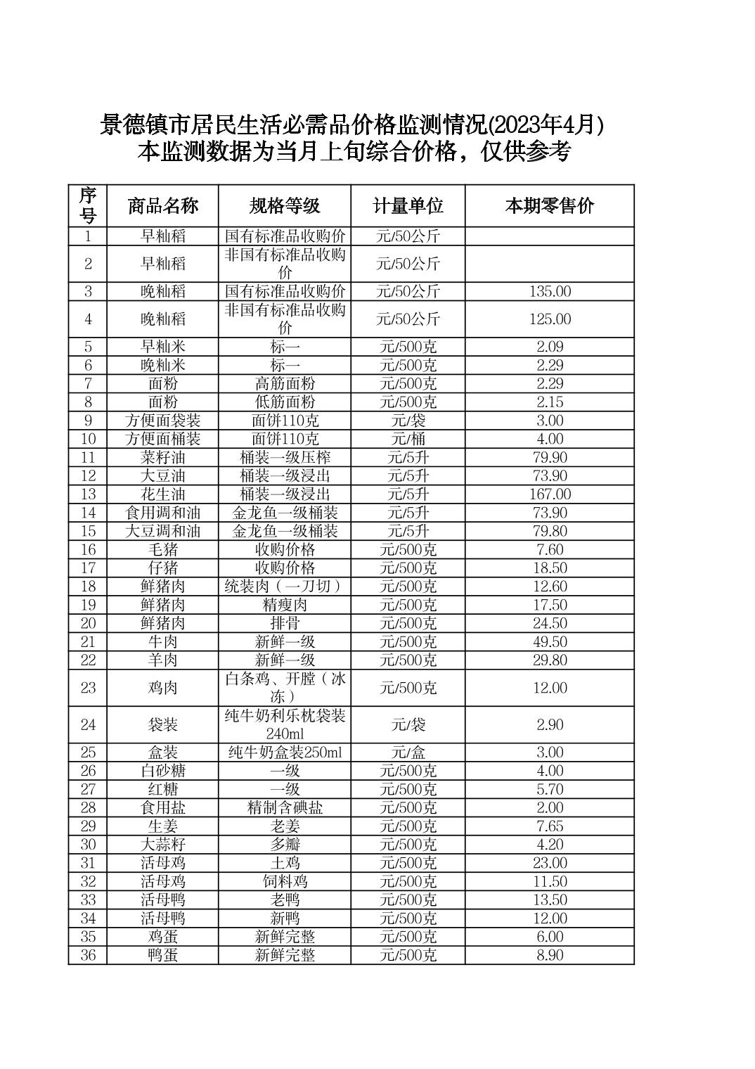 景德镇市中心城区居民生活必需品价格监测点实时价格表(2023年4月)