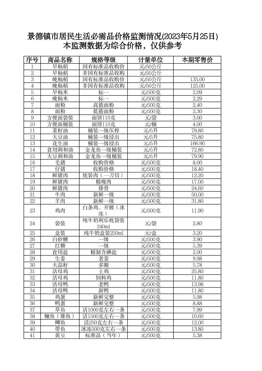 景德镇市居民生活必需品价格监测情况(2023年5月25日)