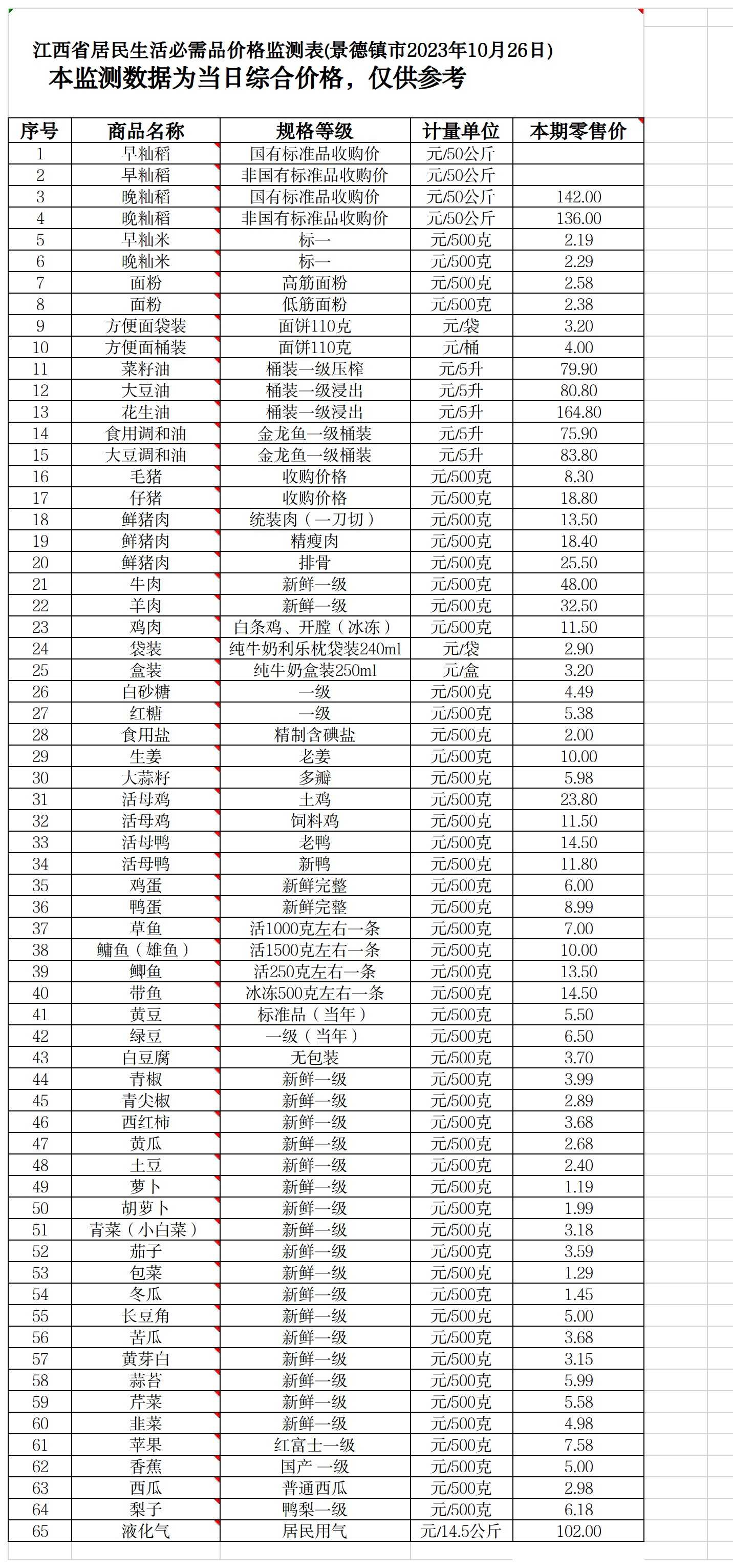 江西省居民生活必需品价格监测表(景德镇市2023年10月26日)