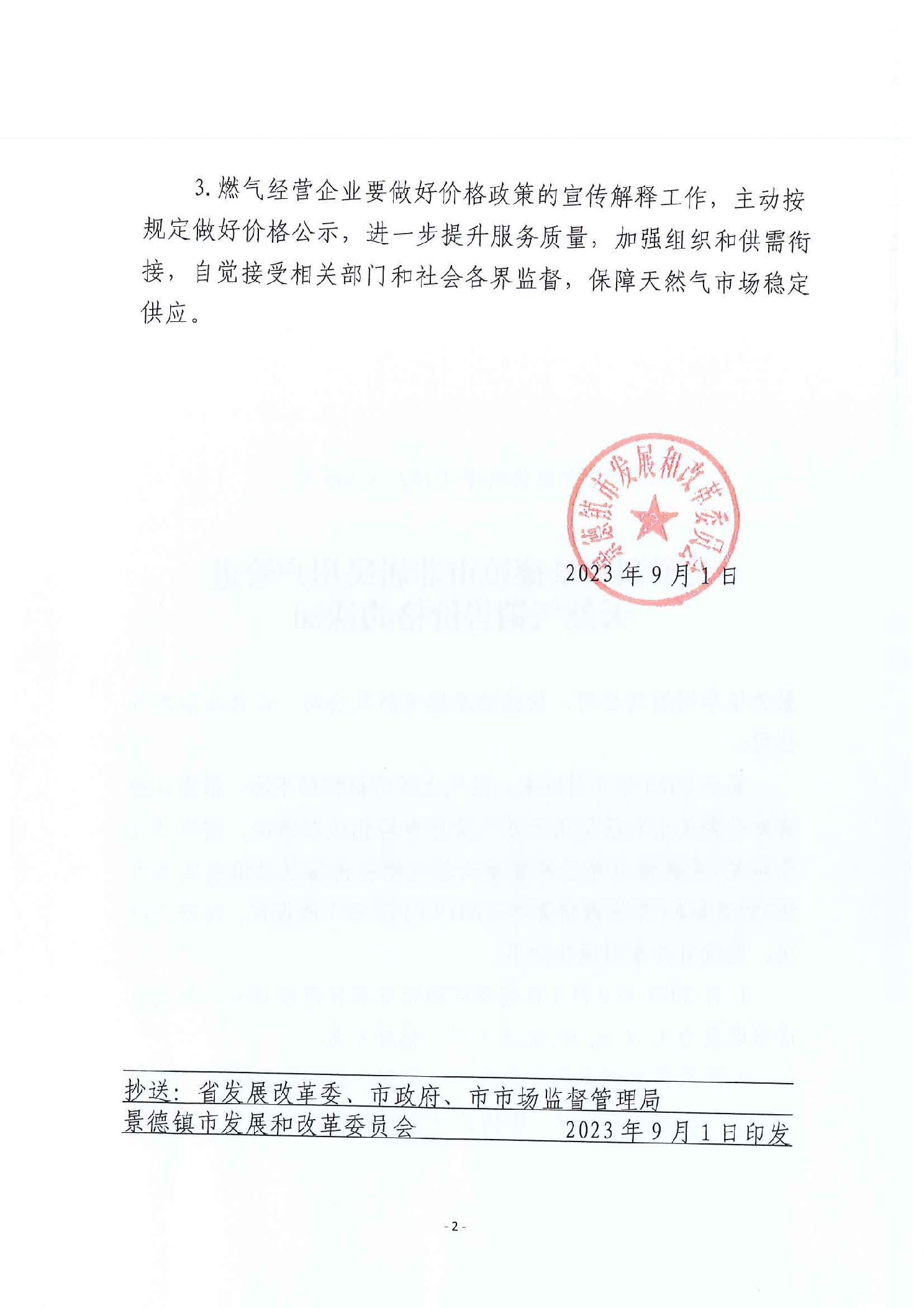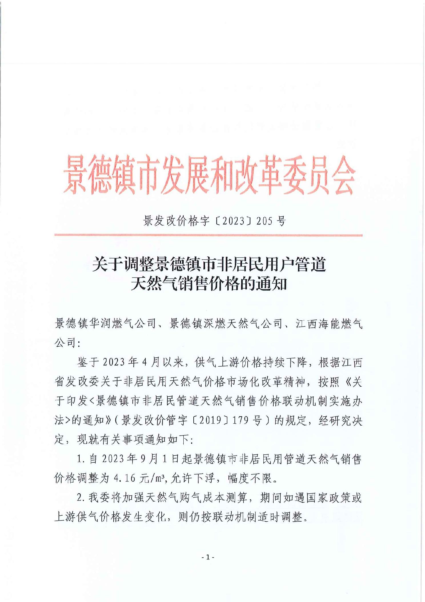 景发改价格字〔2023〕205号关于调整景德镇市非居民用户管道天然气销售价格的通知